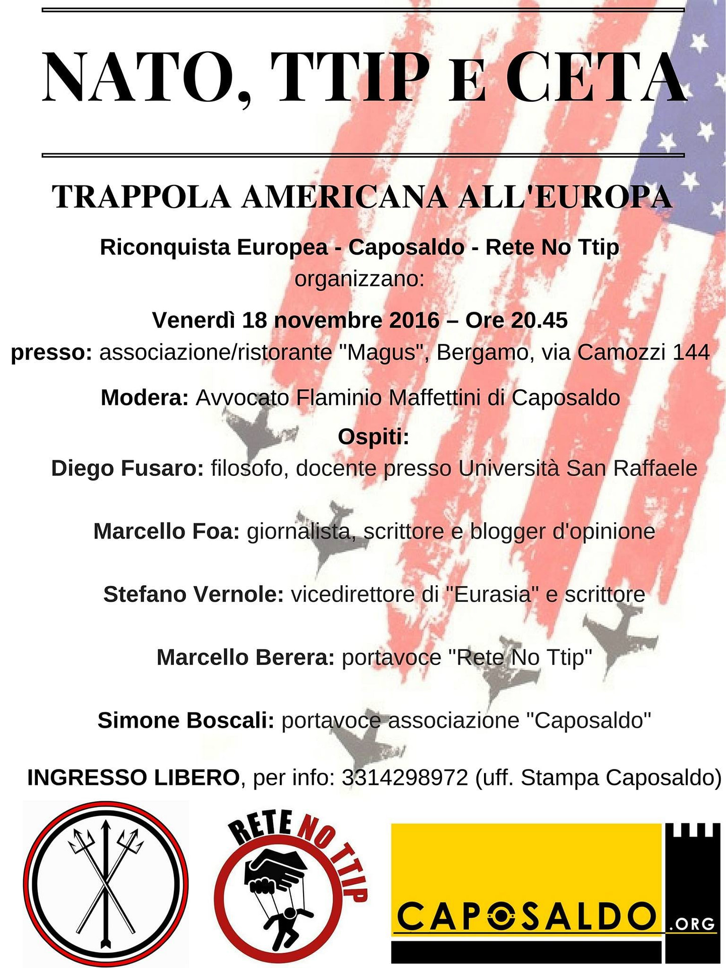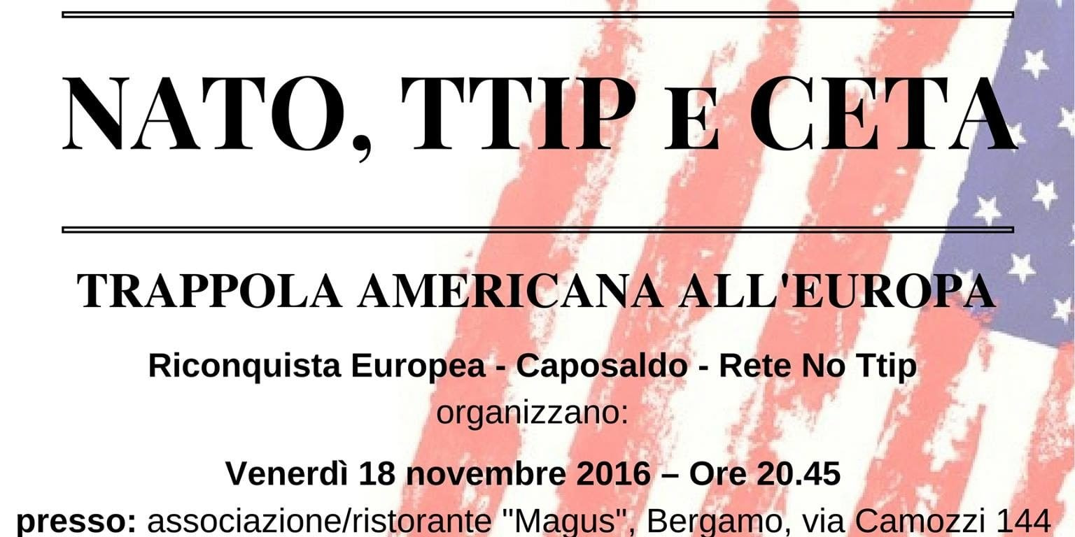 La stagione di conferenze dei gruppi Riconquista Europea, Rete No TTIP e Caposaldo, inizia con un evento che si preannuncia di alto livello e su un tema che, tra frenate e rilanci, continua a essere tra i più significativi per gli interessi della gente comune come per tutte le nazioni europee, Nato, Ttip e Ceta: trappola americana all’Europa.