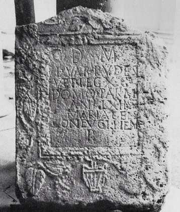 “Agli Dei Mani. Qui giace Lucio Vario Pudente, veterano della Legione X Gemina, di anni sessanta, da Parma. Al piissimo coniuge Maria Geis pose”.
