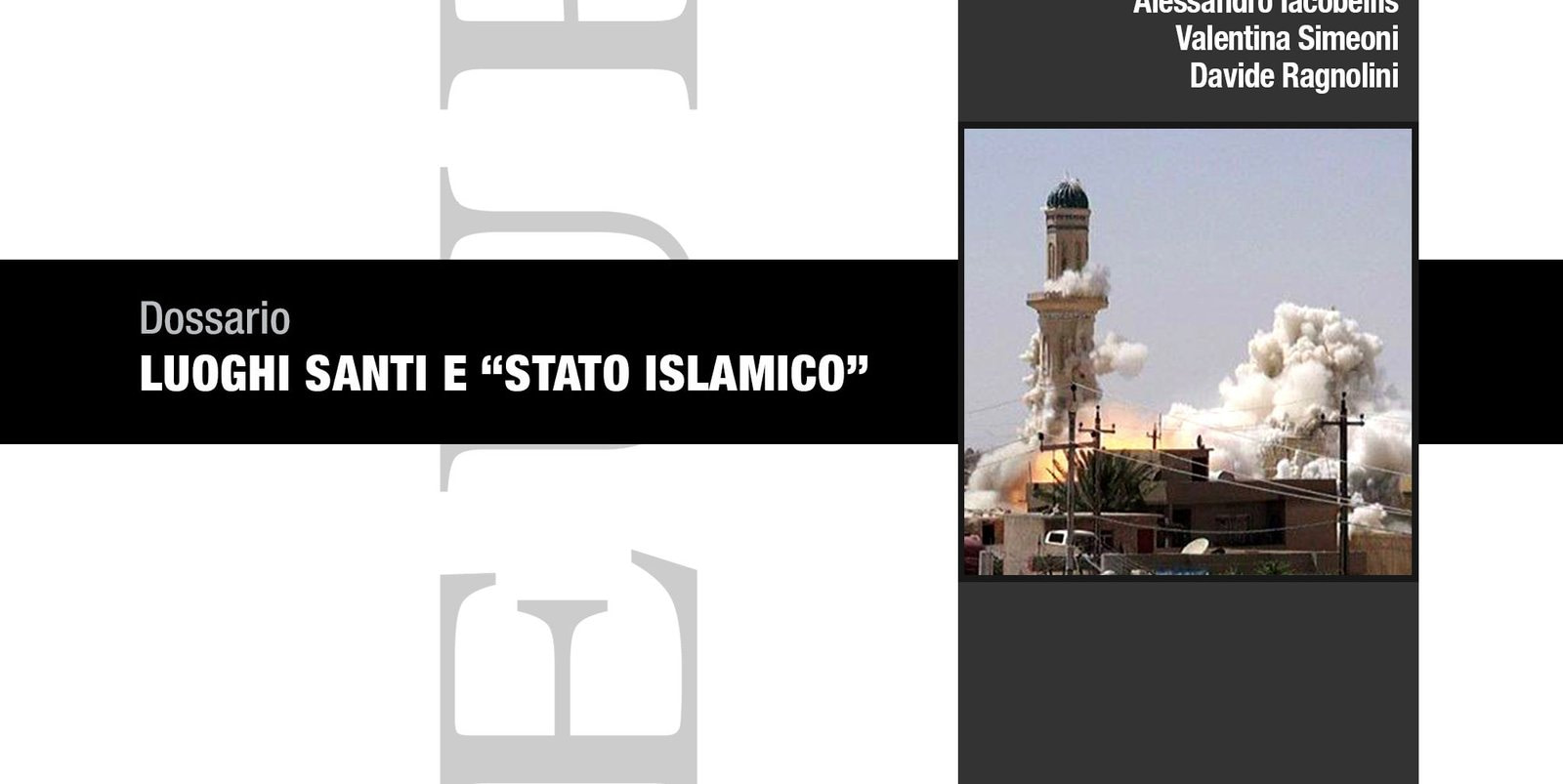 I luoghi di culto e i monumenti religiosi sono infatti un obiettivo privilegiato della furia distruttrice dei miliziani del sedicente “Califfo” Abu Bakr al-Baghdâdî, i quali li considerano centri di apostasia e di politeismo. Nei territori da loro controllati, infatti, sono state devastate o demolite moschee (sia sunnite sia sciite), chiese cristiane, tombe di profeti, di maestri spirituali e di uomini pii. Per limitarci a pochissimi casi emblematici, ricordiamo che a Mossul sono stati abbattuti il mausoleo del profeta Yunus e quello di San Giorgio; a Tikrit sono state fatte saltare in aria la Chiesa Verde (principale testimonianza della comunità assira, risalente al VII secolo) e la moschea dei Quaranta Santi (Wâlî Arba’în), una delle più significative testimonianze dell’architettura islamica del XIII secolo; ad Aleppo è stata ridotta in polvere la Moschea Khosrofiya, costruita nel 1537 dal grande Sinan; a Samarra è stato distrutto il mausoleo di Imam al-Dur, costruito nel 1085.